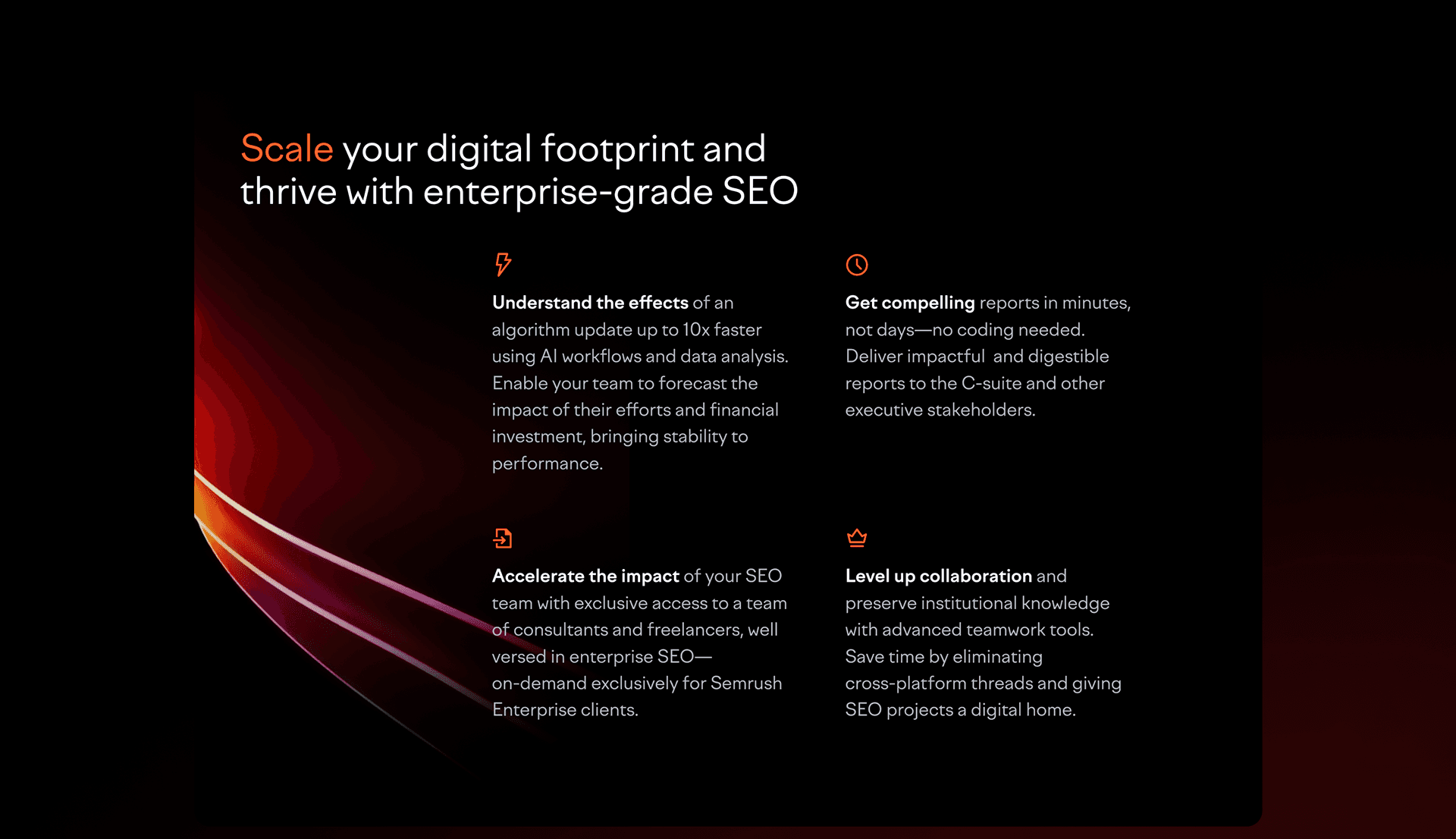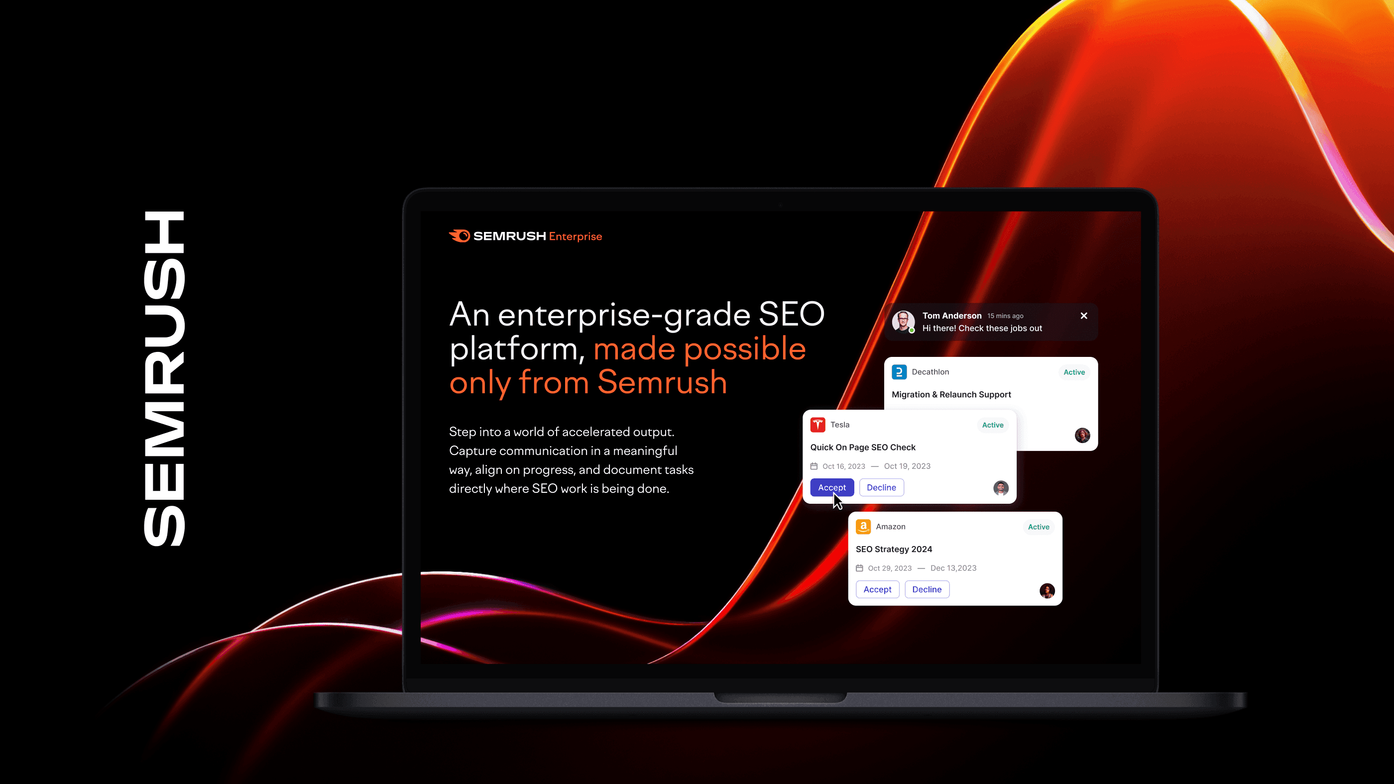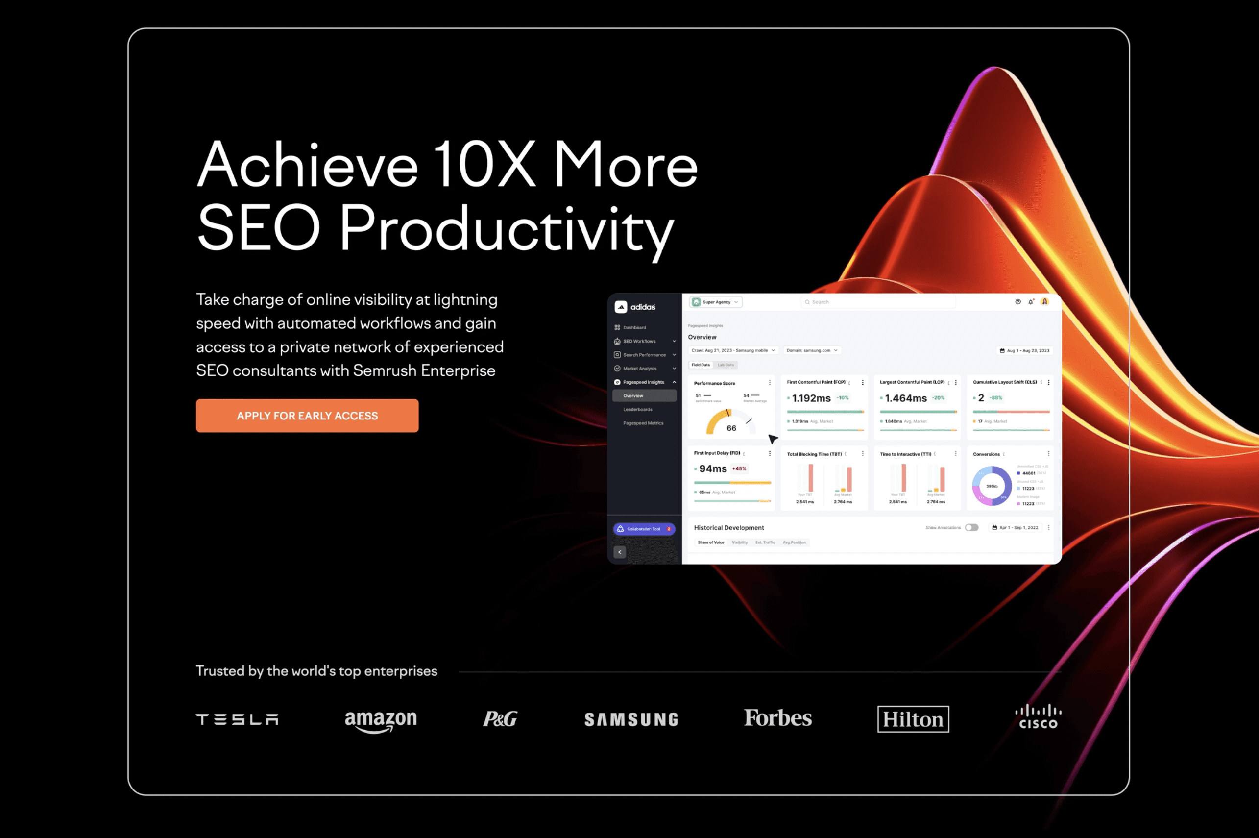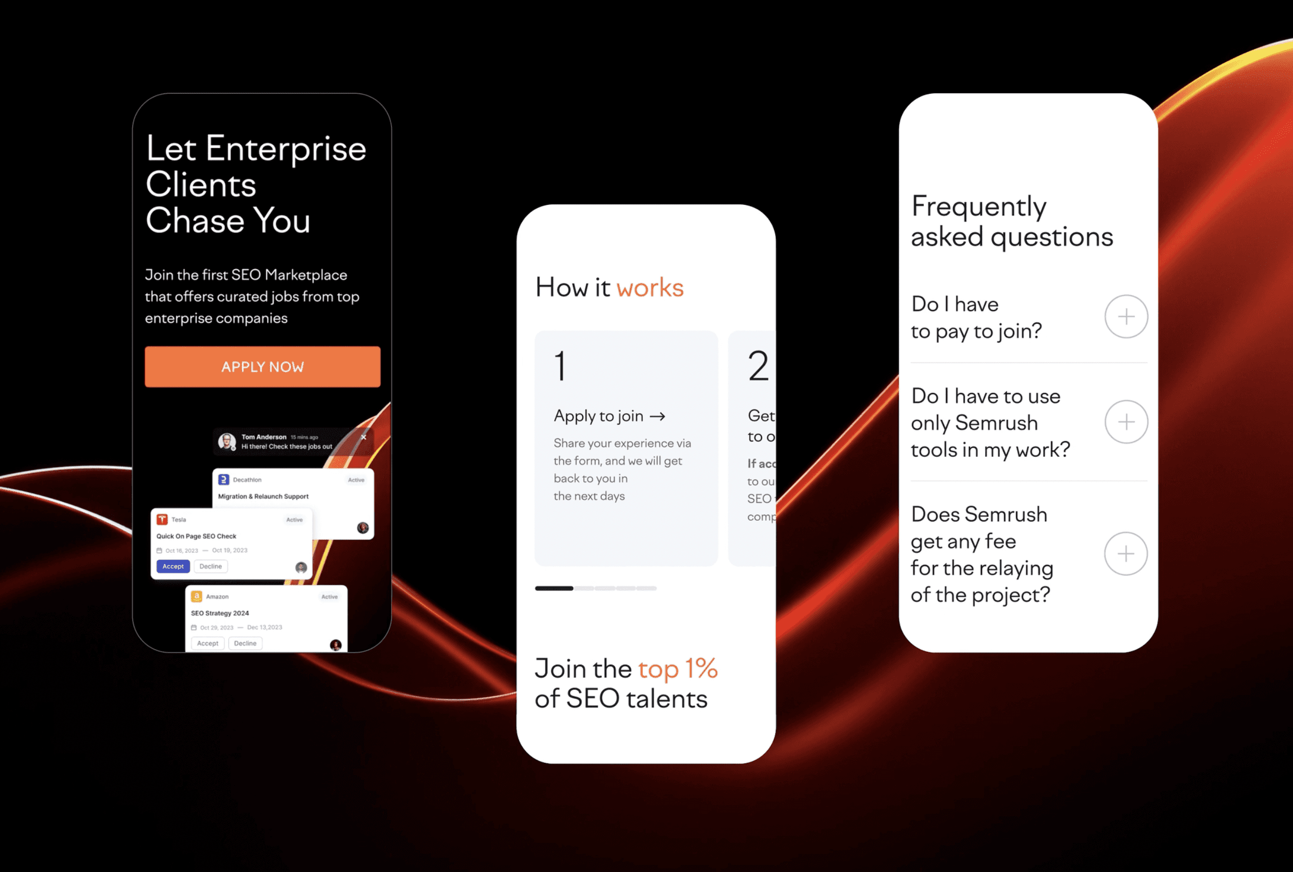 Led UX/UI and web design for the Semrush Enterprise site, adapting the brand to a clean, scalable web format. Worked with C-level stakeholders to define structure and improve clarity.